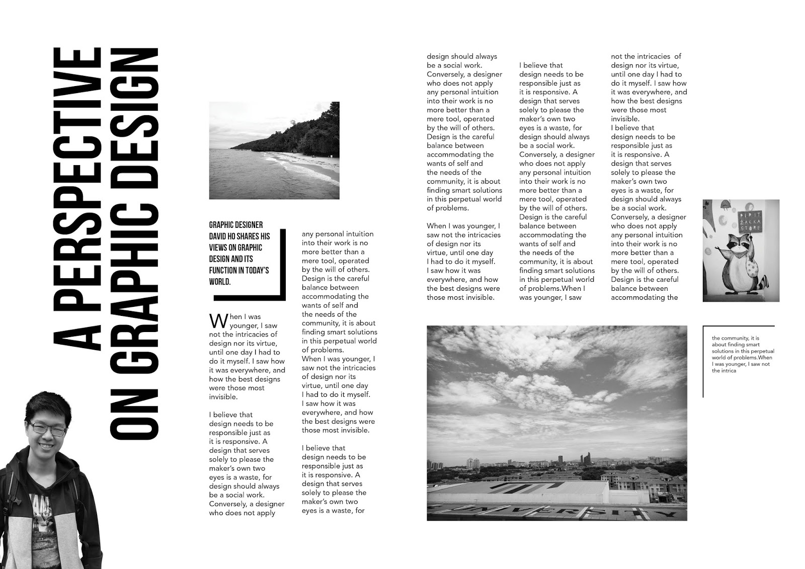 I've learnt that it's important to establish a design direction as early as possible because it helps me make designs faster and more effectively. Despite your best efforts in design, what's also important is to find a good printer! I definitely took a risk with this design, with such huge title text taking up half of my spread. But I am happy to how it turned out and it shows how calculated risks can work in my favour. In future assignments, I hope to explore more on creating spreads and to work in colour.
